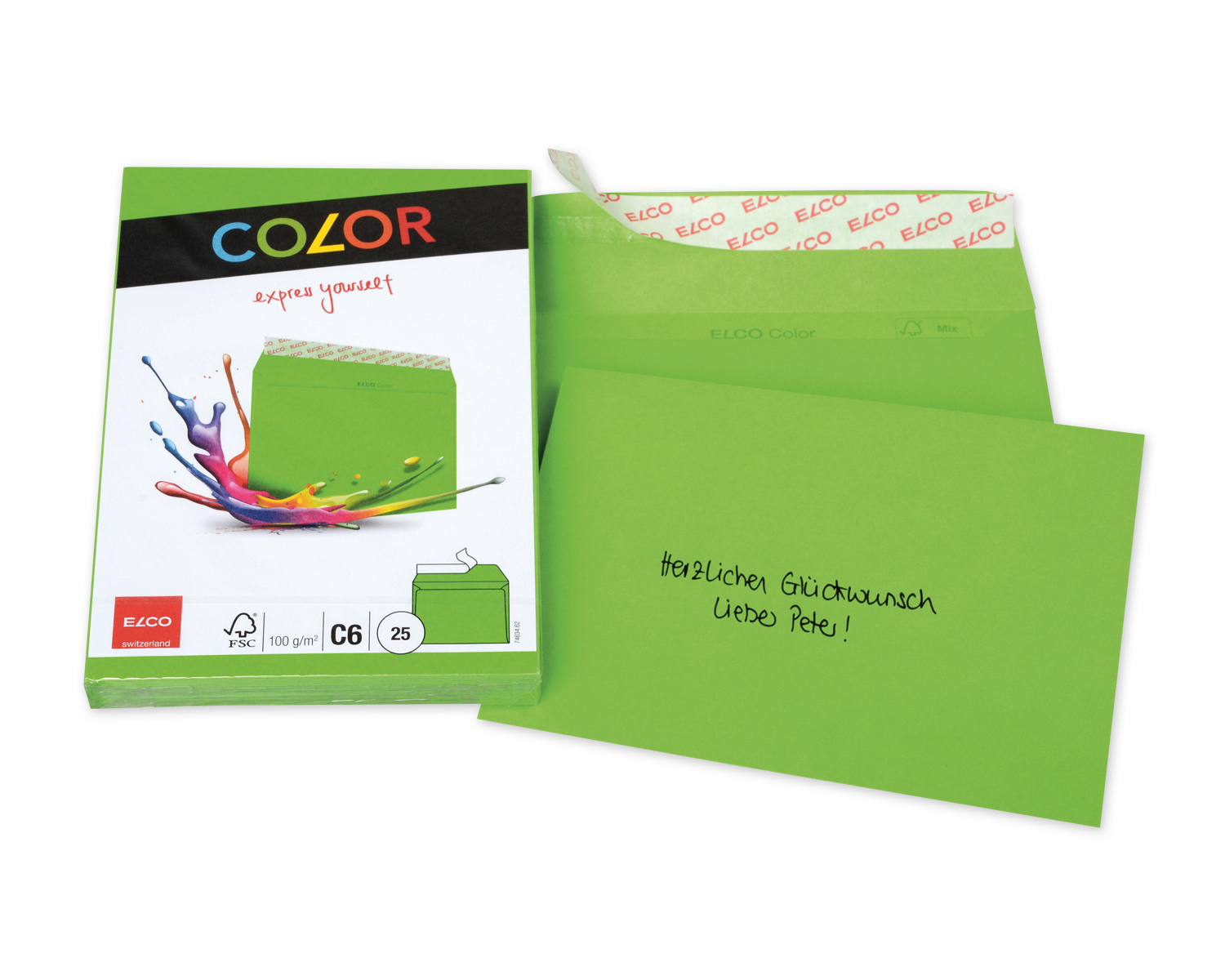 Das intensivgrüne C6 Couvert ohne Fenster und mit Haftklebeverschluss im Bund à 25 Stück. Der lebendige, FSC-zertifizierte Umschlag in einem intensiven Grün für kreative Mailings, die frisch und dynamisch wirken.