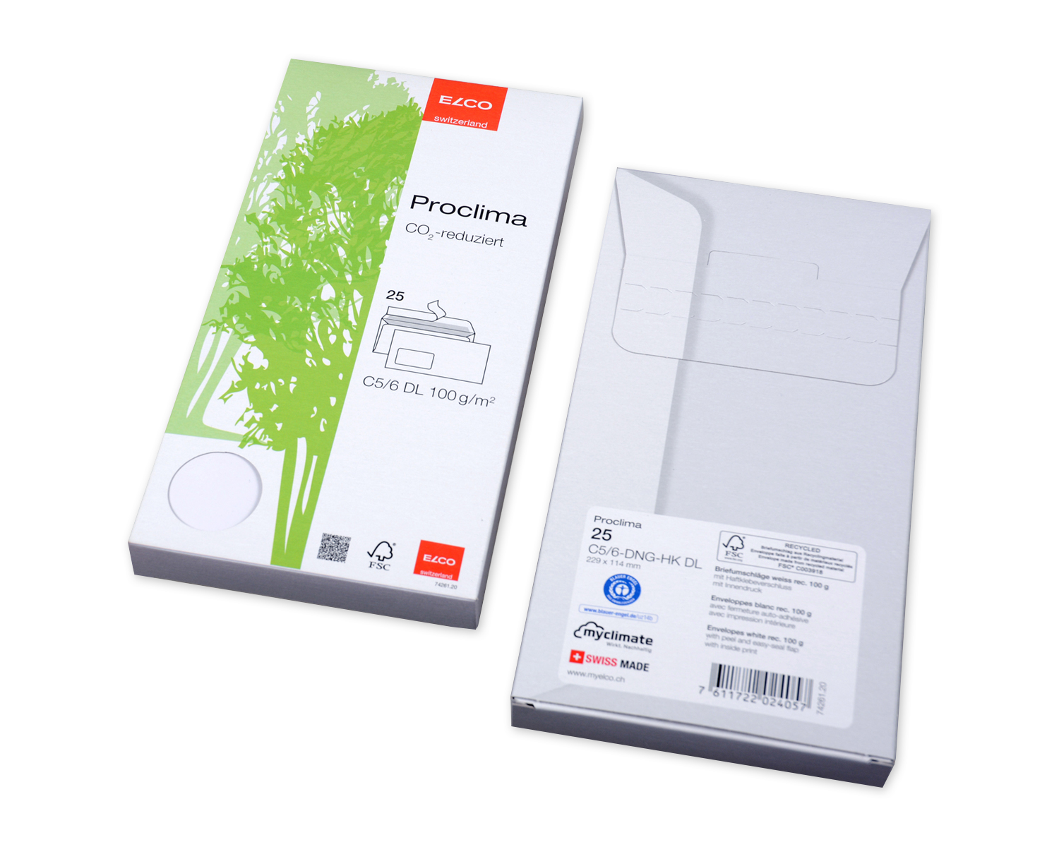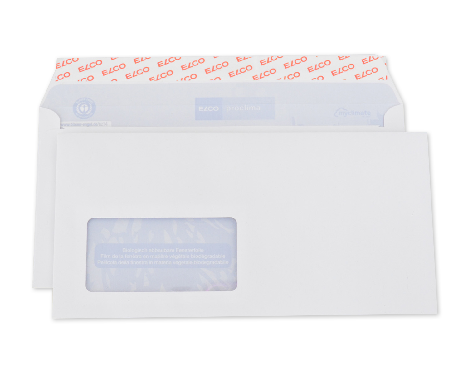 ELCO Proclima Couvert, C5/6, Fenster links, Haftklebeverschluss, weiss mit hervorragender Opazität und Innendruck ELCO Proclima. Proclima - CO2 reduziert: ELCO setzt auf Nachhaltigkeit – auch in der Bürokommunikation. Das Papier der ELCO Proclima ist optisch nicht von Offsetpapier zu unterscheiden und bietet die hohe Weisse von 100 ISO. Trotzdem besteht es zu 100% aus FSC-zertifiziertem Altpapier. Bei seiner Produktion fällt deutlich weniger CO2 pro Tonne an.