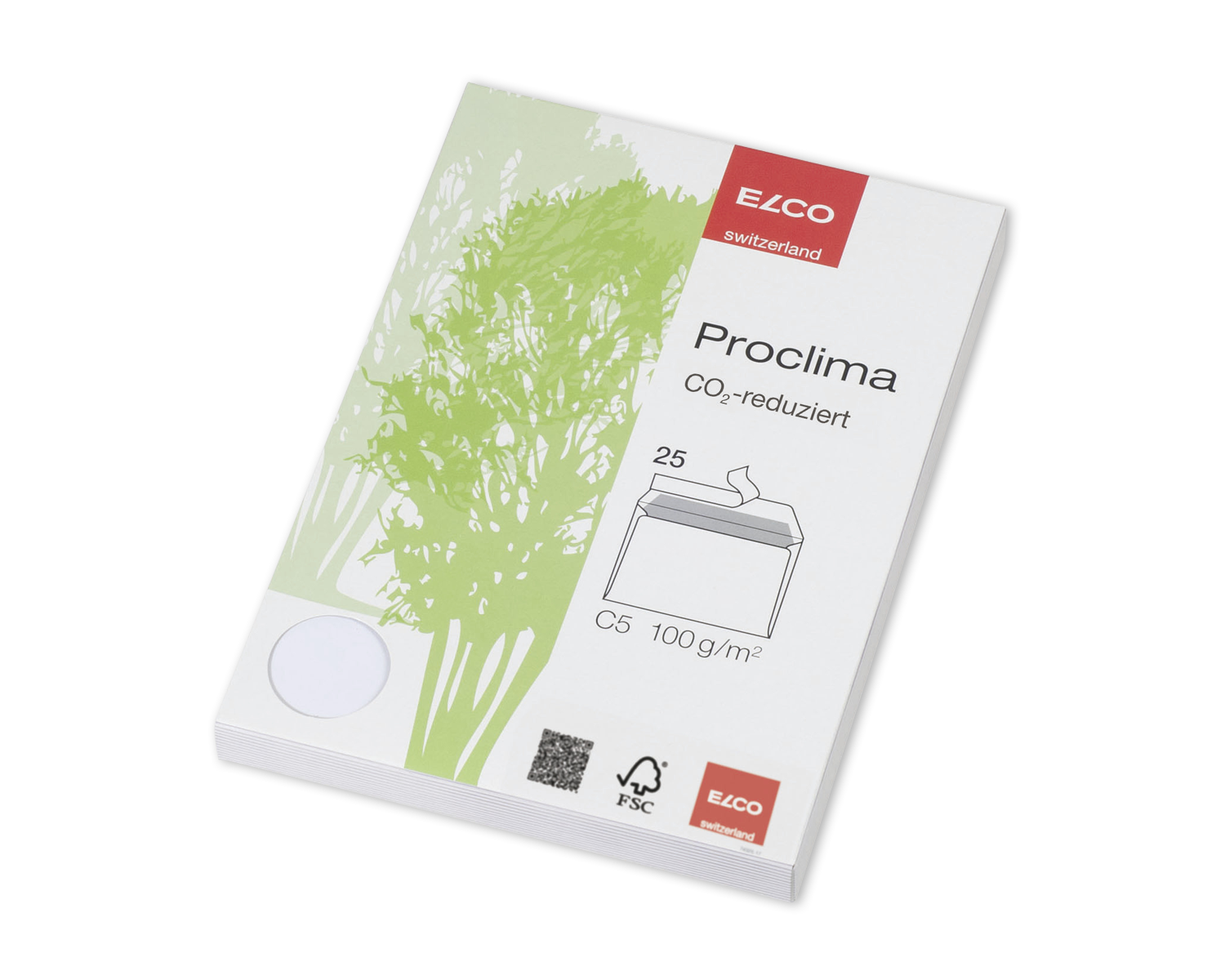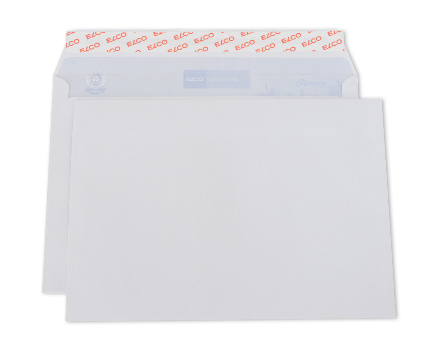 ELCO Proclima Couvert, C5, ohne Fenster, Haftklebeverschluss, weiss, in der praktischen Karton-Box mit hervorragender Opazität und Innendruck ELCO Proclima. Proclima - CO2 reduziert: ELCO setzt auf Nachhaltigkeit – auch in der Bürokommunikation. Das Papier der ELCO Proclima ist optisch nicht von Offsetpapier zu unterscheiden und bietet die hohe Weisse von 100 ISO. Trotzdem besteht es zu 100% aus FSC-zertifiziertem Altpapier. Bei seiner Produktion fällt deutlich weniger CO2 pro Tonne an.