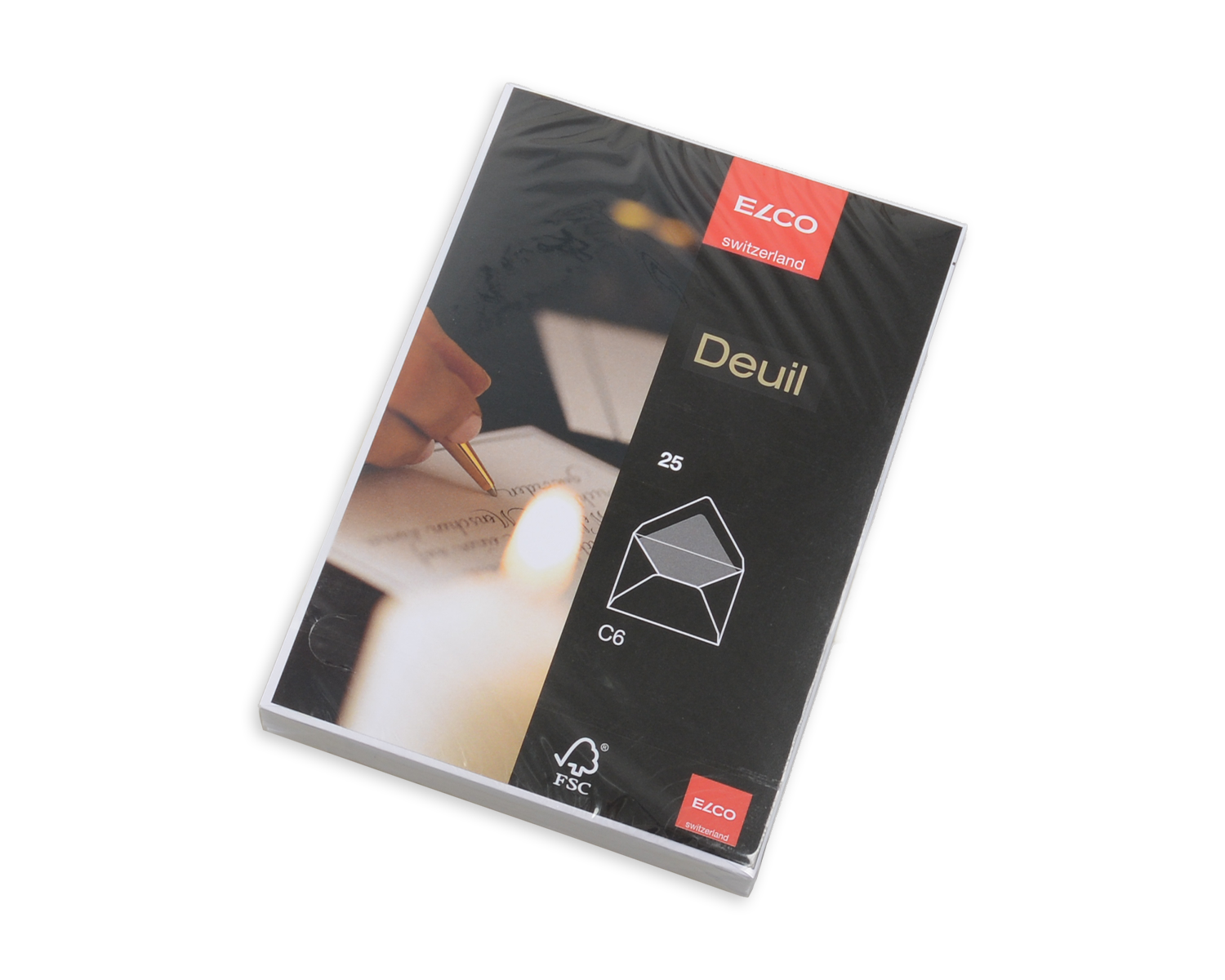 Das hochwertige ELCO Deuil Kuvert im Format C6 eignet sich perfekt für stilvolle Trauerkorrespondenzen. Dieses weisse, gefütterte Kuvert mit 100 g/m² Papierstärke kommt ohne Fenster. Der dezente schwarze Rand auf der linken Seite unterstreicht die würdevolle Gestaltung. Praktisch im Cello-Zip Bund à 25 Stück verpackt.