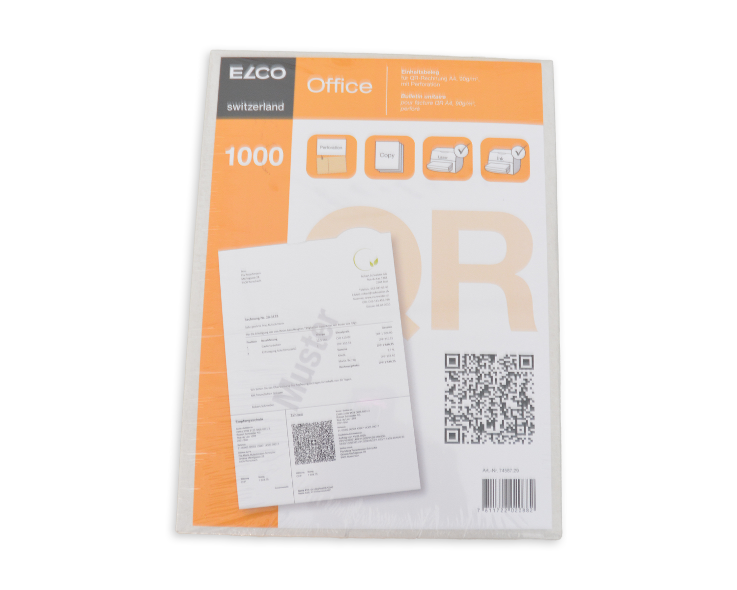 Der Einheitsbeleg für QR-Rechnungen von ELCO ist die ideale Lösung für den modernen Zahlungsverkehr. Dieses A4-Papier, mit einer Grammatur von 90 g/m², ist speziell für QR-Rechnungen konzipiert und verfügt über eine praktische Perforation für den Empfangsschein und den Zahlteil. Mit 1000 Blatt pro Schachtel bietet es ausreichend Material für grosse Druckaufträge. Der Einheitsbeleg ist für Laser-, Farblaser- und Inkjetdrucker geeignet und garantiert eine saubere und professionelle Abwicklung Ihrer Rechnungen.