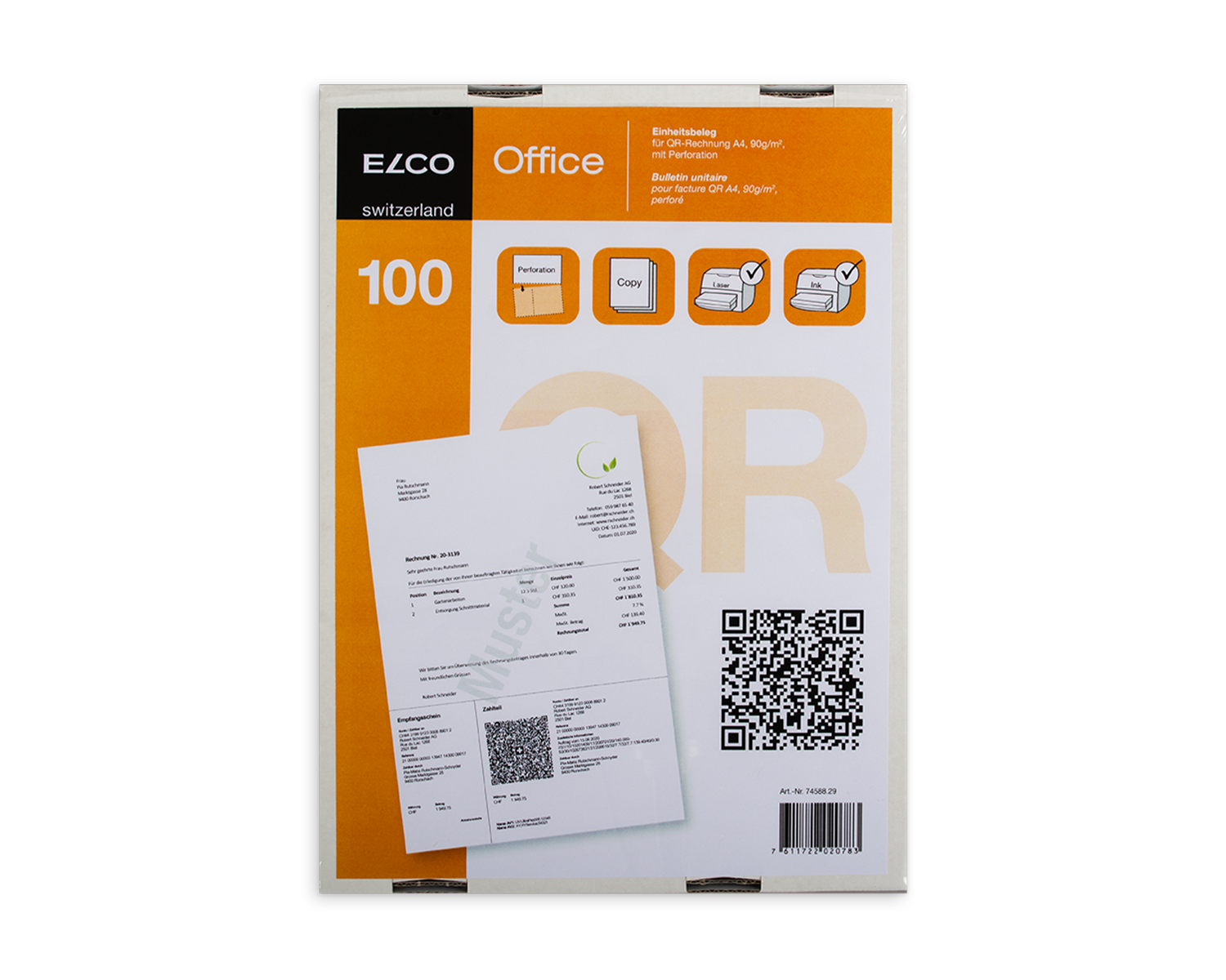 Der Einheitsbeleg für QR-Rechnungen von ELCO ist die ideale Lösung für den modernen Zahlungsverkehr. Dieses A4-Papier, mit einer Grammatur von 90 g/m², ist speziell für QR-Rechnungen konzipiert und verfügt über eine praktische Perforation für den Empfangsschein und den Zahlteil. Mit 100 Blatt pro Schachtel bietet es ausreichend Material für kleine Druckaufträge. Der Einheitsbeleg ist für Laser-, Farblaser- und Inkjetdrucker geeignet und garantiert eine saubere und professionelle Abwicklung Ihrer Rechnungen.
