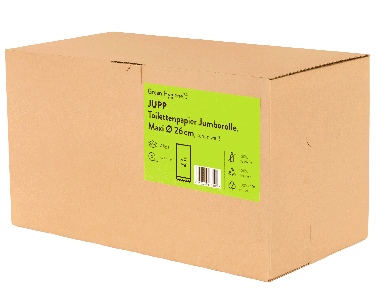 Die Jumborollen "Jupp" von Green Hygiene bestechen durch ihre ausgezeichnete Nachhaltigkeit. Die Produktion erfolgt zu 100% CO2-Neutral und unter alleiniger Verwendung von recyceltem Altpapier. Gleichermassen ökologisch ist die Verpackung, bei der vollständig auf Plastik verzichtet wird. Jupp ist somit zu 100% Plastikfrei. Das ideale WC-Papier für den umweltbewussten Hygienebereich von Raststätten, öffentlichen Einrichtungen und Grossveranstaltungen.
