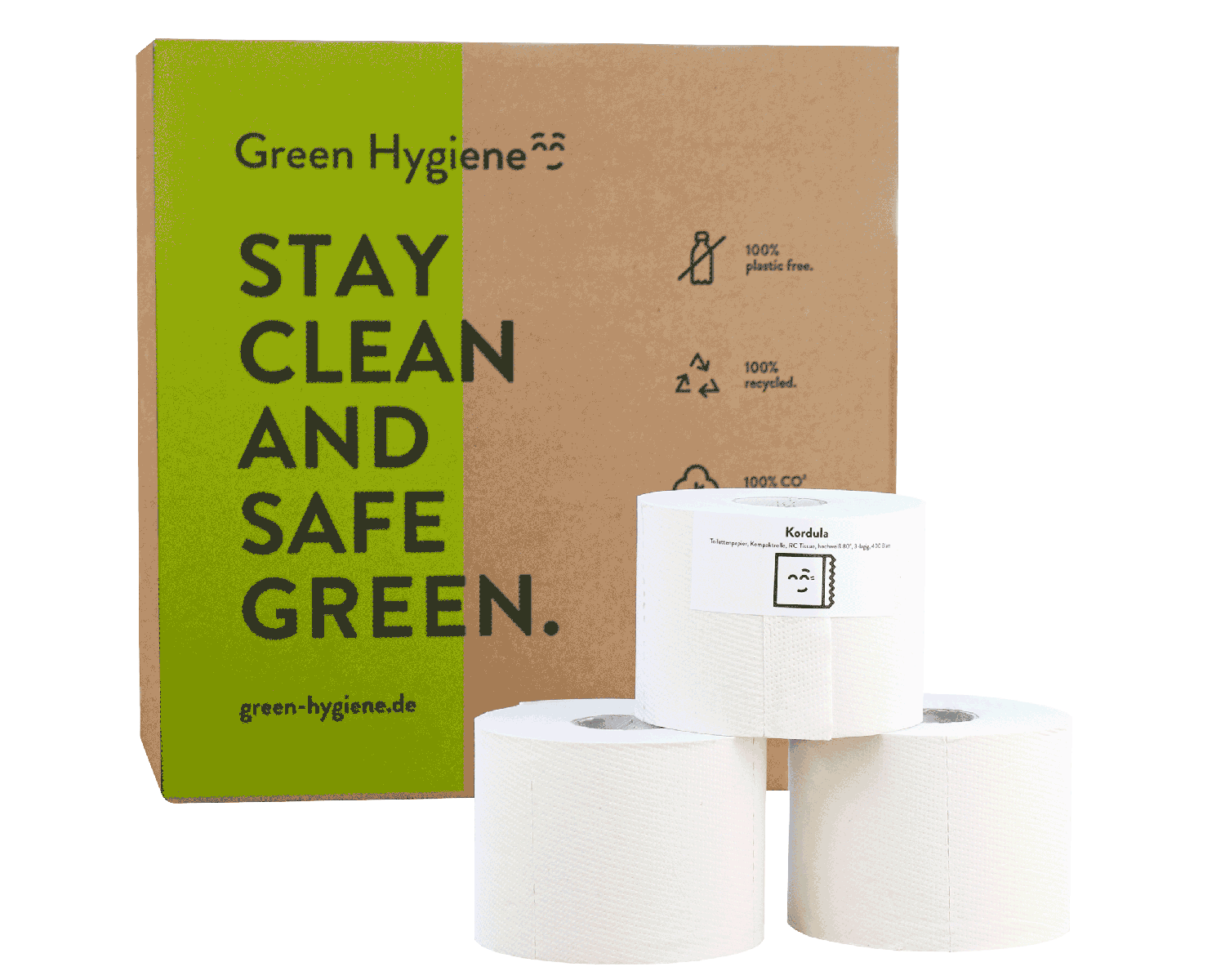 Das WC-Papier "Kordula" von Green Hygiene besticht durch seine ausgezeichnete Nachhaltigkeit. Die Produktion erfolgt zu 100% CO2-Neutral und unter alleiniger Verwendung von recyceltem Altpapier. Gleichermassen ökologisch ist die Verpackung, bei der vollständig auf Plastik verzichtet wird. Kordula ist somit zu 100% Plastikfrei. Das ideale WC-Papier für den umweltbewussten Hygienebereich von Raststätten, öffentlichen Einrichtungen und Grossveranstaltungen oder im privat Gebrauch.