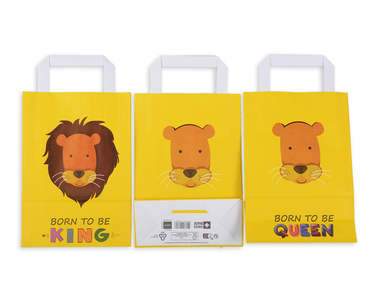Mach dein Geschenk zum royalen Highlight! Die liebevoll gestaltete Geschenktasche mit Löwenmotiv und dem Spruch „Born to be king / Born to be queen“ ist perfekt für kleine und grosse Könige und Königinnen. Ob zum Kindergeburtstag, zur Baby Shower oder einfach als besonderes Geschenk für Tierliebhaber – diese robuste Papiertasche mit Flachhenkel sorgt garantiert für strahlende Augen. Nachhaltig, stabil und einfach tierisch schön!