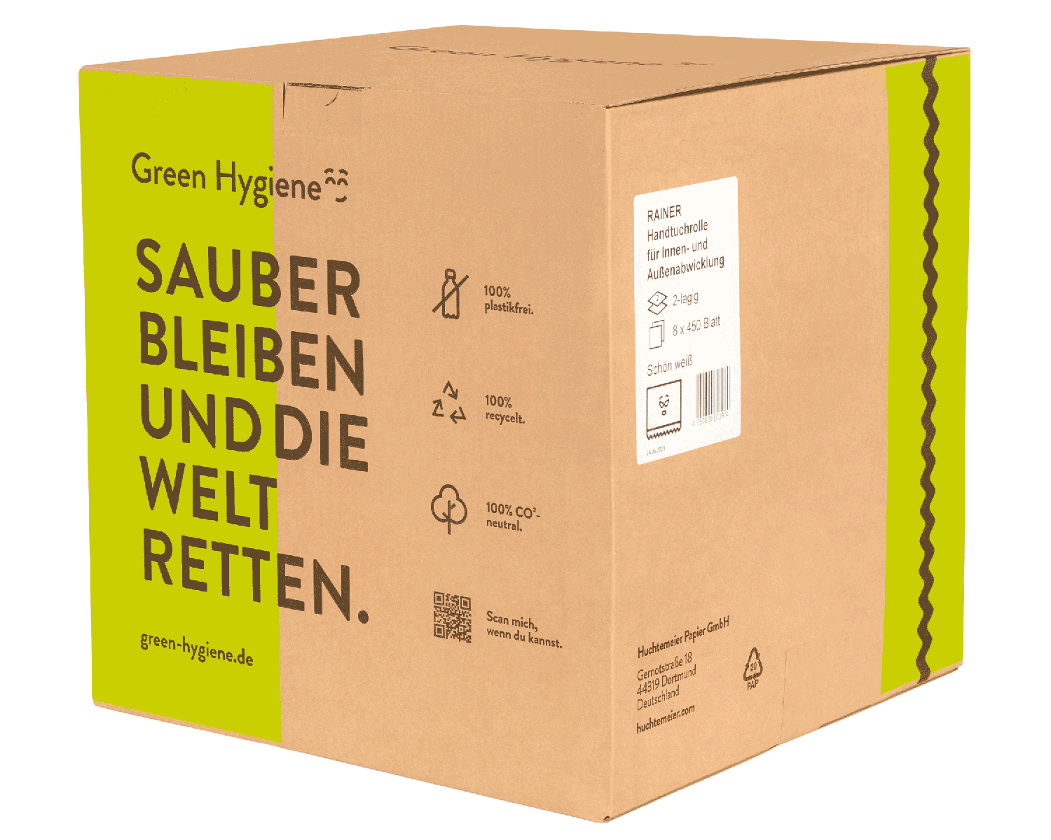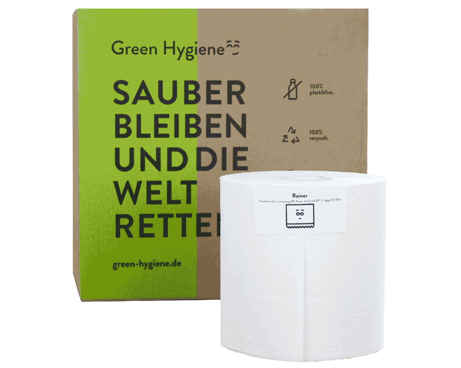 Les rouleaux d'essuie-mains "Rainer" de Green Hygiene se distinguent par leur excellente durabilité. La production est 100% neutre en CO2 et n'utilise que du papier recyclé. L'emballage est tout aussi écologique, puisqu'il ne contient pas de plastique. Rainer est donc 100% sans plastique. Le rouleau d'essuie-mains idéal pour le secteur de l'hygiène respectueux de l'environnement dans les restoroutes, les établissements publics et les grandes manifestations.