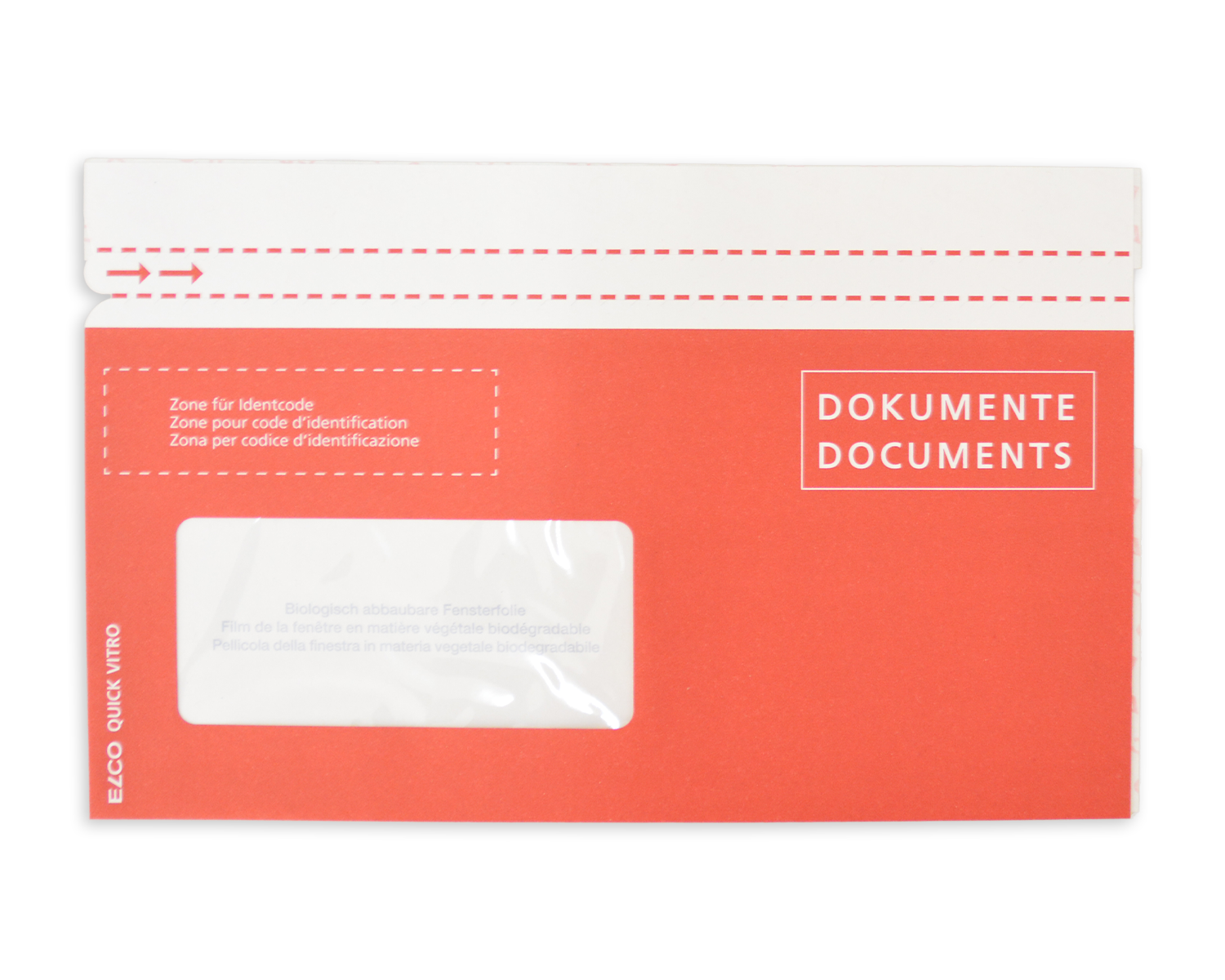 La pochette pour documents C5/6 ELCO Quick Vitro en rouge porte l'impression « Documents » et dispose d'une fenêtre biodégradable à gauche. Fabriquée en papier 110 g/m², elle offre une fermeture autocollante et une perforation pour une ouverture facile. Idéal pour l'envoi de documents d'accompagnement nécessitant un emballage sûr et durable. Disponible en petit paquet pratique de 20 pièces.