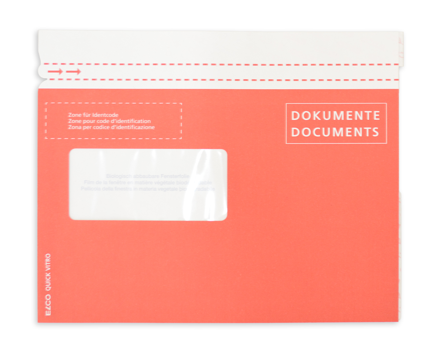 La pochette pour documents ELCO Quick Vitro au format C5 avec l'impression rouge « Documents » offre une solution durable pour l'envoi de documents d'accompagnement. Elle est fabriquée en papier 110 g/m² et dispose d'une fenêtre biodégradable à gauche ainsi que d'une double fermeture adhésive. La perforation facilite l'ouverture de la pochette sans endommager les documents.