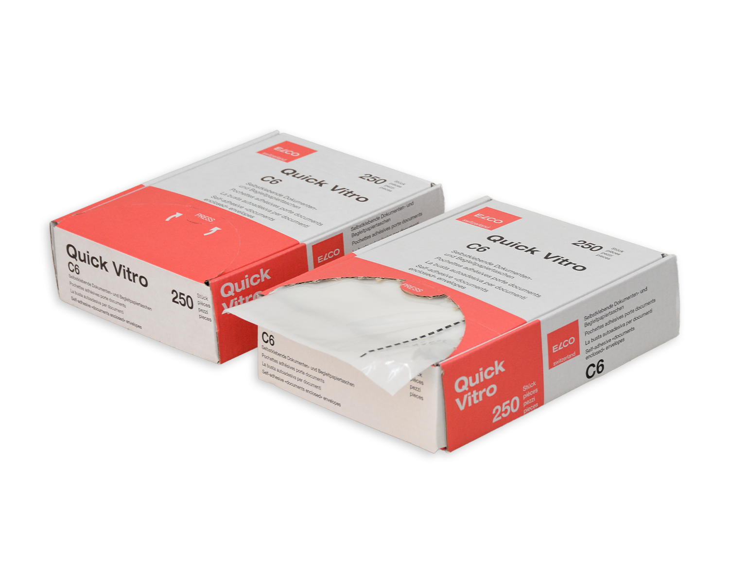 Porte-documents, ELCO Quick Vitro, C6, Sans fenêtre, Fermeture auto-adhésive, transparente 147.64 CHF / 1000 pièceNuméro d'article: 29011.00Disponible immédiatement
